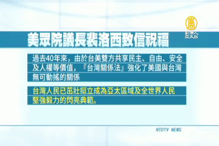 聯邦眾議院議長裴洛西(Nancy Pelosi)也致中文信祝福,他在信中指出,「過去40年來,由於台美雙方共享民主、自由、安全及人權等價值,『台灣關係法』強化了美國與台灣無可動搖的關係。」「台灣人民已茁壯挺立成為亞太區域及全世界人民堅強毅力的閃亮典範。」