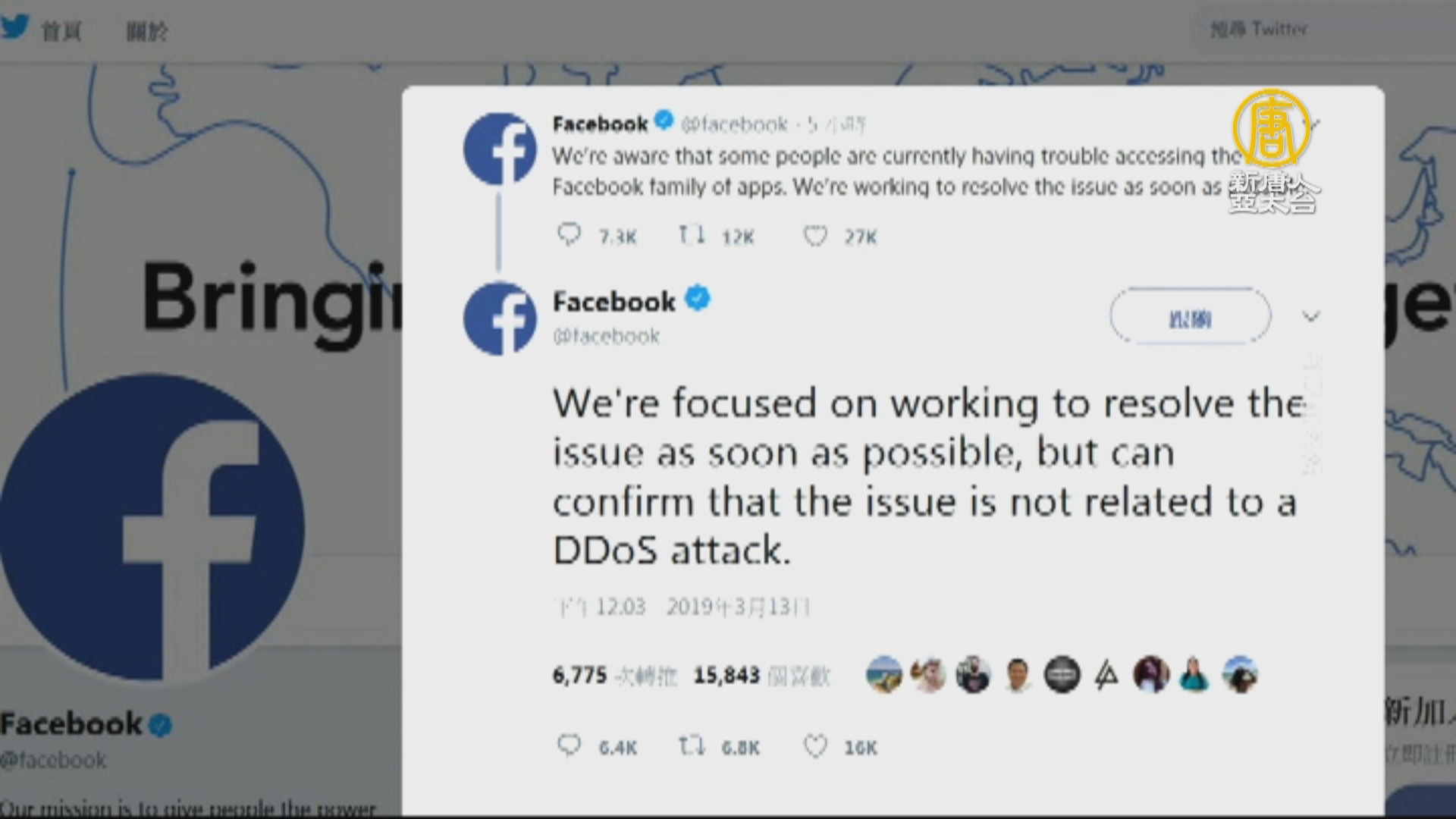 【新唐人亞太台 2019 年 03 月 14 日訊】再來關心,繼昨天Google服務的Gmail及Google雲端硬碟發生全球大當機事件後,臉書旗下Facebook、Instagram及WhatsApp今天凌晨也跟著出包,臉書透過推特表示,已在全力修復中,但排除是網路 阻斷式攻擊」 (DDos) 所致。