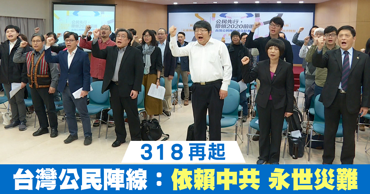 【新唐人亞太台 2019 年 03 月 18 日訊】318學運五周年,學者與公民團體成員成立「台灣公民陣線」,將大舉集結各公民團體力量,因應中共銳實力滲透壓迫,並提出五項行動因應,包括創新經濟、團結社會、民主防衛,以及2020大選公民政綱,主動與台灣各政黨對話。