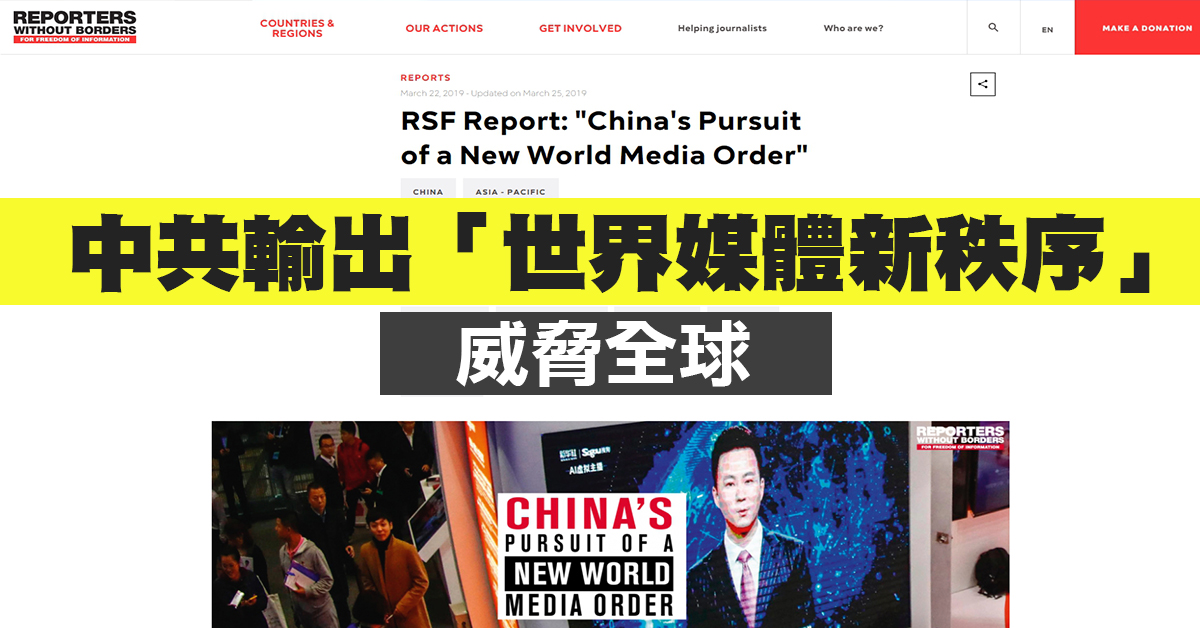 無國界記者組織(Reporters Without Borders)3月25號發布報告,標題為「中國追求的世界媒體新秩序」。報告以中文、英文、法文版本闡述中共政權過去十年如何控制境外資訊的策略,如何在世界各地媒體施展影響力。其中包括將電視廣播系統現代化、向國際媒體大量購買廣告、滲透外國媒體。同時還採取勒索、恫嚇和騷擾等手段。報告認為:這已經嚴重影響世界的新聞自由。