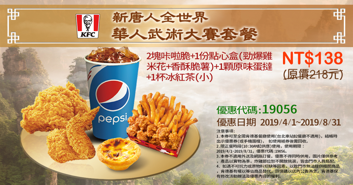 肯德基【新唐人♥全世界華人武術大賽套餐】優惠代碼19056