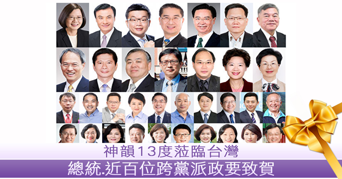 除了蔡英文總統外,包括立法院長蘇嘉全、立法院副院長蔡其昌等13位中央部會首長,與台北市長柯文哲等20名地方政府首長、59名立法委員與4位地方政要,皆發文迎賀神韻再度抵台。