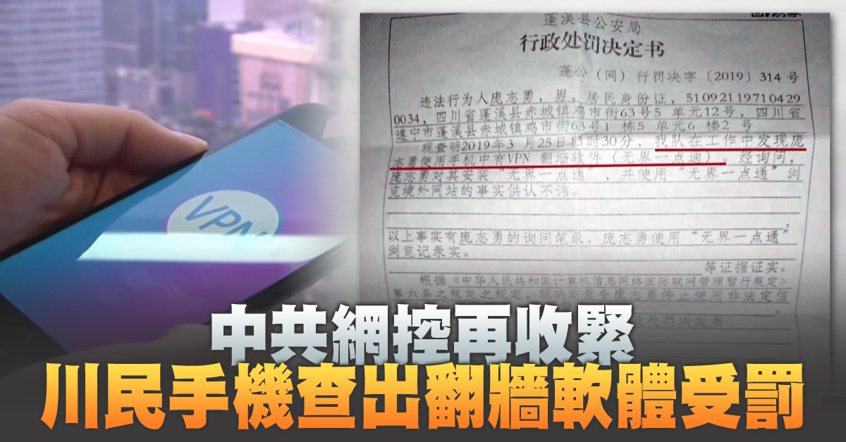 日前,四川蓬溪縣網民龐志勇的手機,被當地公安查到安裝了突破中共網路封鎖的VPN「翻墻」軟體,遭到行政警告處罰。