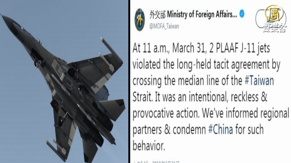 【新唐人亞太台 2019 年 04 月 01 日訊】早安新唐人先來關心,中華民國國防部昨天表示,共軍2架殲11戰機,在31日星期天,上午11點越過台灣海峽中線,並進入台灣西南面空域,空軍增派戰機緊急升空攔截後,共軍飛返中線以西;中央社報導,當時共機距離台灣仍約185公里。外交部晚間也在官方推特發布推文表示,這是刻意的、魯莽的、挑釁的行為。我們已經通知區域內的夥伴,並譴責中共行為。總統府發言人黃重諺昨晚表示,這是對兩岸現狀的公然破壞。對此,中華民國政府給予強烈譴責,也提醒中共應停止危害區域和平福祉的行為,不要成為國際的麻煩製造者。