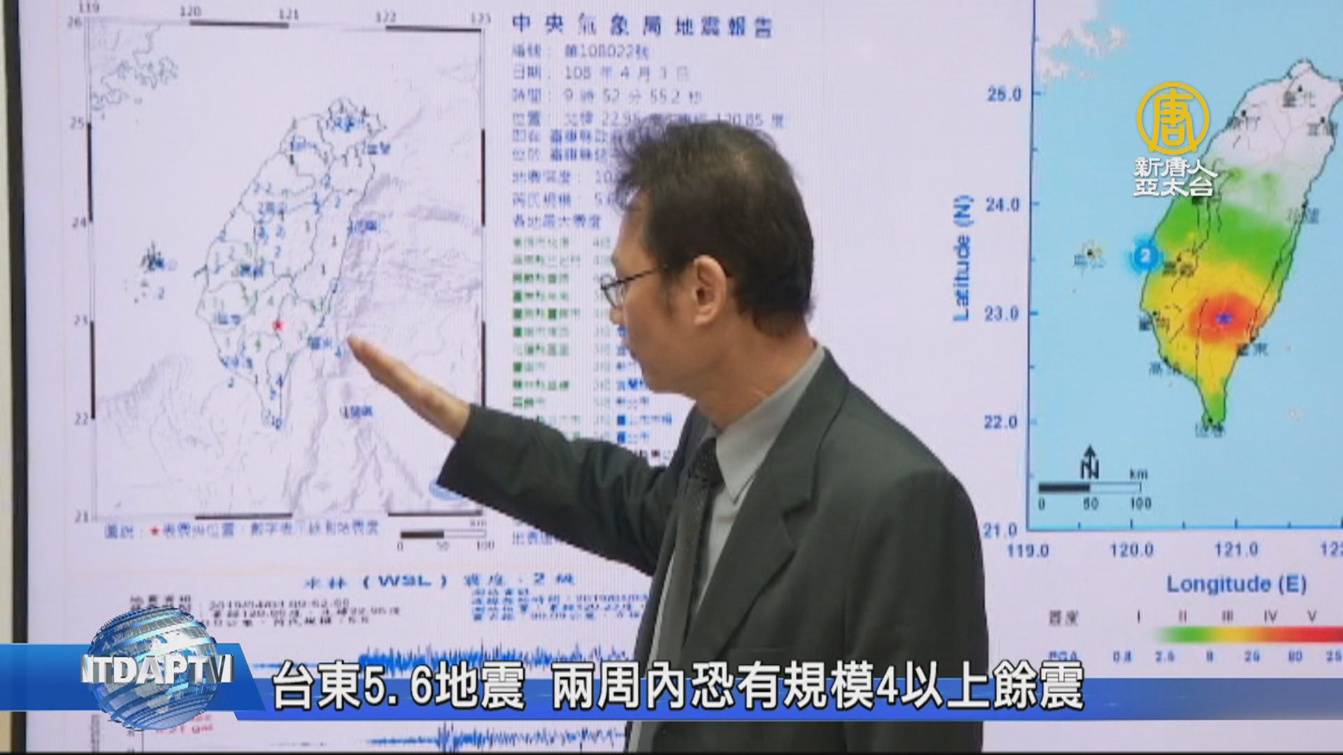 【新唐人亞太台 2019 年 04 月 03 日訊】午報頭條先關心,地牛又翻身,台東上午9點52分發生芮氏規模5.6地震,地震深度僅有10公里,屬於淺層地震,由於規模大、深度淺,全台都有感,其中最大震度在高雄、屏東、嘉義達4級。氣象局地震測報中心表示,地震發生原因是板塊衝撞造成,2周內不排除有規模超過4以上餘震發生。
