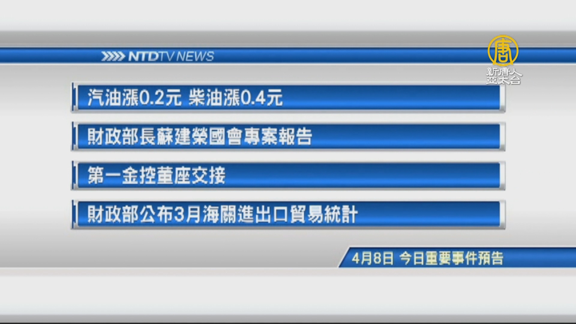 【新唐人亞太台 2019 年 04 月 08 日訊】接著看到,今天,4月8日,星期一 ,有哪些重要活動。首先是,民生消息,汽、柴油今天凌晨起各調漲0.2、0.4元。再來是,財政部長蘇建榮國會專案報告。接著看到,第一金控董座交接。最後是,財政部公布3月海關進出口貿易統計。