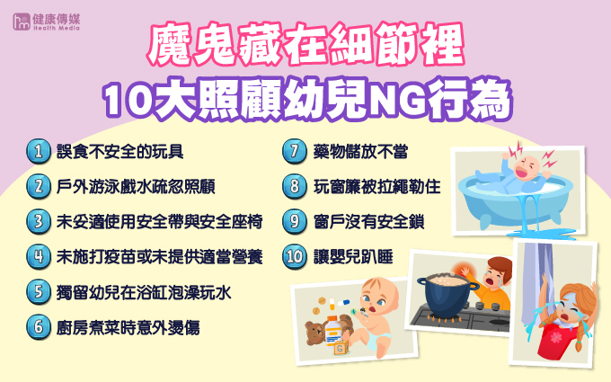 財團法人長庚紀念醫院兒少保護中心提出由醫師根據臨床經驗觀察,票選出家長10大照顧疏忽行為,其中以「嬰兒趴睡」最為常見。(圖/健康傳媒製作)