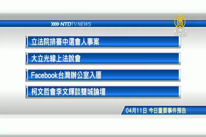 立法院排審中選會人事案;大立光線上法說會;Facebook台灣新辦公室啟動典禮;以及台北市長柯文哲將見上海台辦主任李文輝,討論雙城論壇。