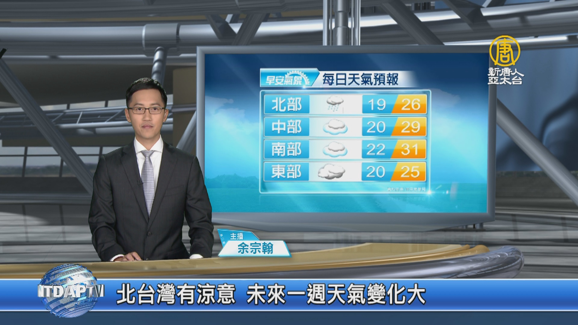 【新唐人亞太台 2019 年 04 月 15 日訊】歡迎您收看4月15日的早安新唐人,我是余宗翰,先來帶您關心今天的天氣情況。今天受東北季風影響,北台灣會稍有涼意,桃園以北、宜花地區溫度將下降4至7度,北部、東部地區、中南部山區要注意短暫陣雨,新一波的鋒面將於周二下半天通過台灣,未來一週台灣水氣多、天氣變動快,溫度轉涼,提醒要多留意天氣狀況和溫度變化。帶您一起來看到國際媒體重要訊息。
