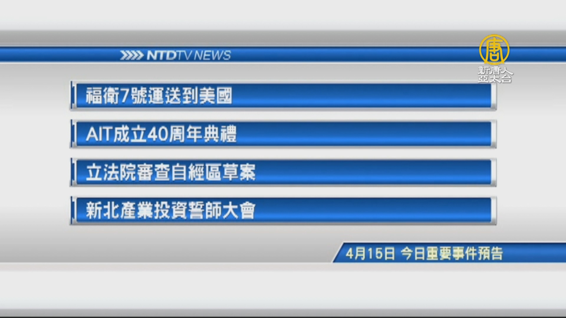 福衛7號運送到美國;AIT「台灣關係法與台美40年友誼」慶祝酒會;立法院聯席會議,審查《自由貿易經濟特區特別條例》草案;以及新北產業投資誓師大會。