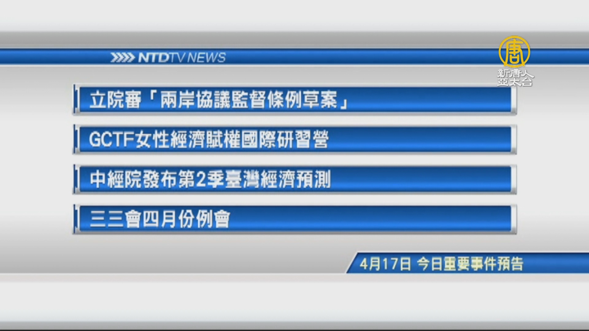 【新唐人亞太台 2019 年 04 月 17 日訊】接著看到,今天,4月17日,星期三 ,有哪些重要活動。首先是,