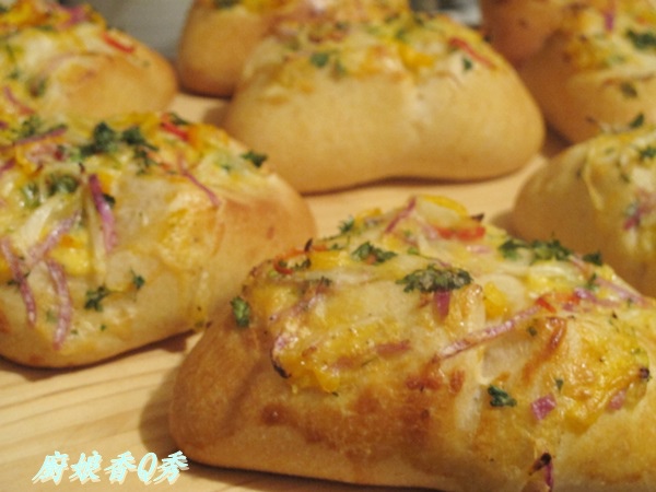 起士絲120克、彩椒2.3個(小的)、巴西里適量、鹽少許(不要多,只是要讓蔬菜軟一點,烤的時候才不容易烤焦)、洋蔥(白的、紫的各一些)、黑胡椒適量、橄欖油1小匙