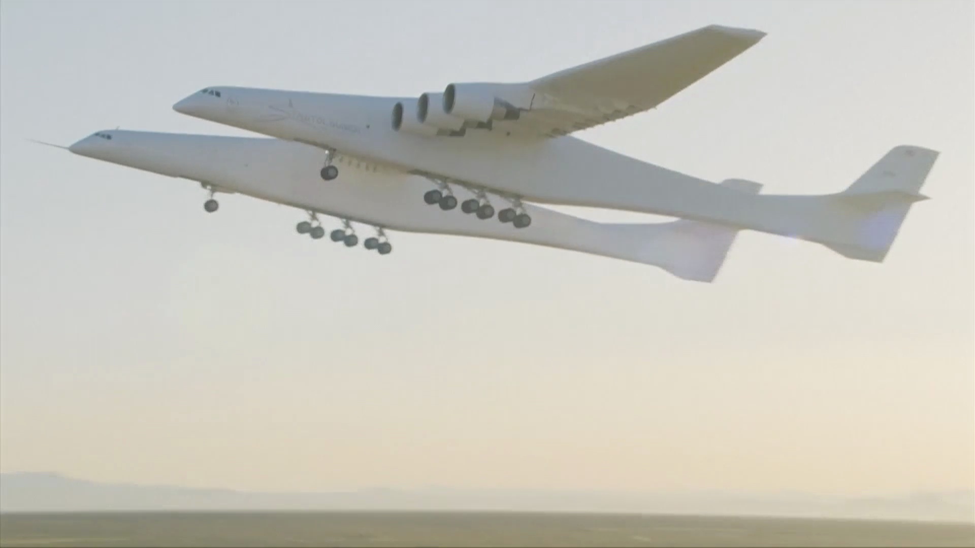 巨大的雙機身噴氣式飛機清晨從莫哈韋航空和太空港起飛,最高高度1.7萬英尺(約5180米),最高速度一度達到189英里/小時(約合304公里/小時)。該型飛機重達226噸,機翼展(117米)超過了美式橄欖球場地長度(109米),裝有6臺發動機、起落架設計有28個輪子。