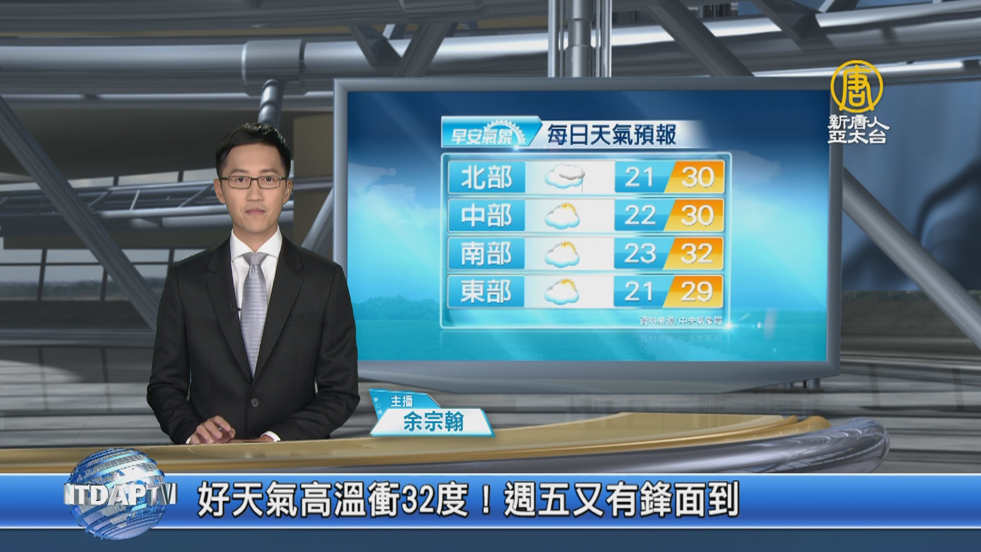 【新唐人亞太台 2019 年 04 月 18 日訊】歡迎您收看4月18日的早安新唐人,我是余宗翰,先來帶您關心今天的天氣情況。今天各地大多為多雲到晴的天氣,只有花東地區有零星雨勢,午後山區有局部短暫陣雨,而各地高溫可來到28至32度,近中午稍感悶熱,提醒民眾外出多補充水分。週五之後將有鋒面雲系持續影響台灣到週日,天氣較不穩定。帶您一起來看到國際媒體重要訊息。
