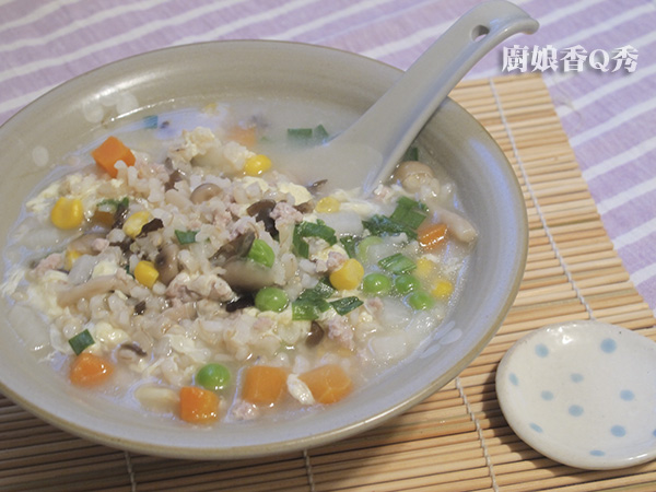 煮熟糙米飯一碗、黑木耳3朵、柳松菇1大匙、蛋一個、山藥半碗、碎豬肉2大匙、冷凍蔬菜(紅蘿蔔、碗豆、玉米粒)半碗、蔥花一大匙、鹽適量、白胡椒粉適量