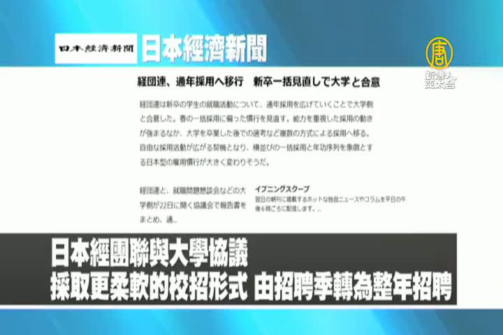 【新唐人亞太台 2019 年 04 月 19 日訊】來看到日本經濟新聞報導:日本經濟團體聯合會與大學協議,採取更柔軟的校招形式,由招聘季轉為整年招聘。
