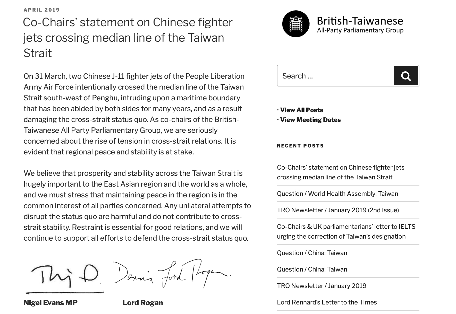 英國上下議院資深議員發表聯合聲明,嚴正關切中共軍機越過台海中線。(截圖/台英國會有台小組官網)