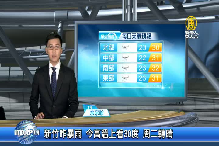 【新唐人亞太台 2019 年 04 月 22 日訊】歡迎您收看4月22日的早安新唐人,我是余宗翰,先來帶您關心天氣情況。又是一個星期的開始了,昨天因為颮線發威,新竹地區出現暴雨,今天,將會是又濕又熱的天氣,各地氣溫都將飆破30度,不過,中部及北部,仍不排除有大雷雨的機會,南部及東半部也會有局部陣雨,一直要到周二,各地才會轉為多雲到晴的天氣。帶您一起來看到國際媒體重要訊息。