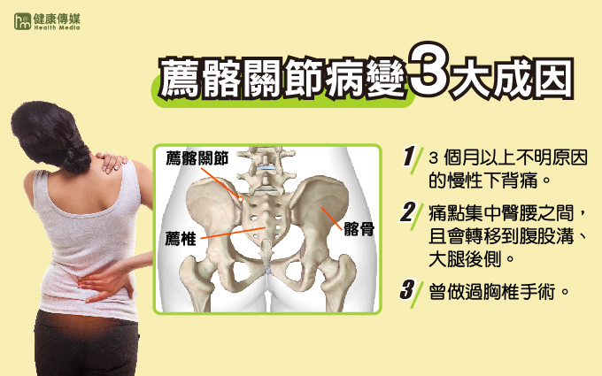 薦髂關節病變原因:(一)慢性下背痛超過3個月以上,無法得到明確診斷。(二)痛的地方集中腰、臀部的地方,且痛會轉移到腹股溝、大腿後側。(三)曾經做過胸椎手術。(圖/健康傳媒製作)