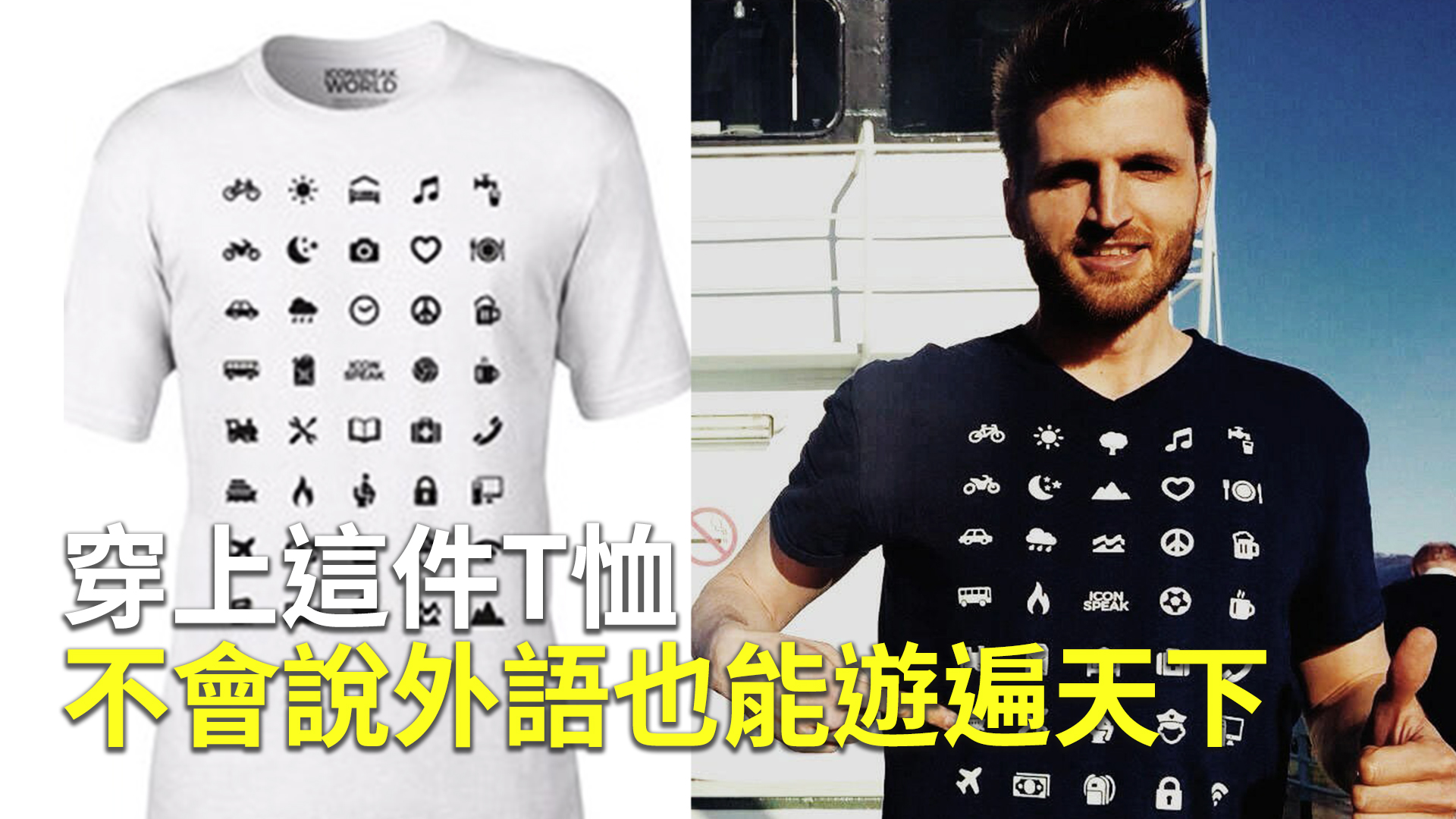 這款T恤名叫「iconspeak」,也就是指著衣服上的圖標來溝通。設計這T恤的,是出自三個瑞士人的創意點子,他們經常出國,也曾遭遇語言不通的種種不方便。於是想到,把世界上任何地方都常見的可識別的圖標,通通放在一件衣服上面,不管是想喝水、找住宿、找餐廳,只要指出來,身上的衣服就是隨身的翻譯機,減少很多溝通比手畫腳的時間。