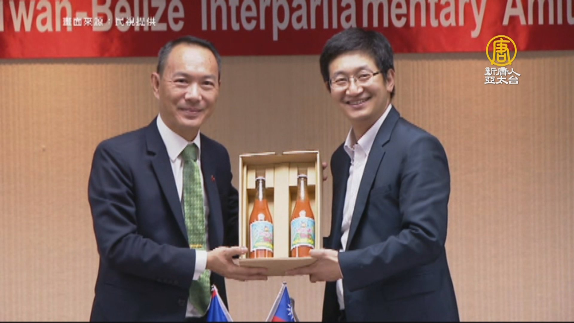 立委蔡適應送上準備好的「神秘禮」給貝里斯國會參議院議長鄭經緯,看到這個禮物,雙方很有默契。