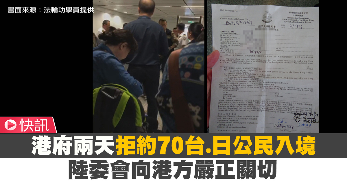 香港政府連續兩天拒絕約70名台灣與日本公民入境。昨天(26日)港府無理由拒絕入境、強制遣返,約33名修煉法輪功的台灣公民、1名日本公民入境;台灣政府昨天已嚴重關切。港府今天(27日),又已拒絕35名修煉法輪功的台灣公民入境,台灣陸委會今表示,向港方嚴正抗議。日媒NHK昨天採訪被遣返的日本公民。