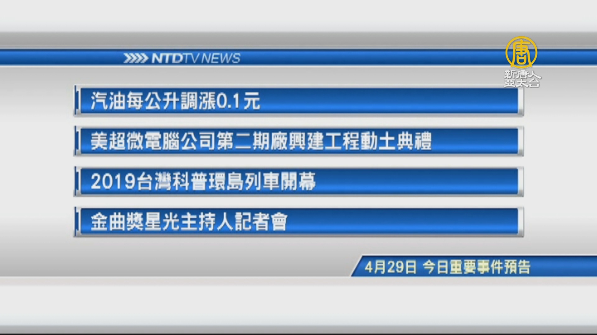 【新唐人亞太台 2019 年 04 月 29 日訊】接著看到,今天,4月29日,星期一 ,有哪些重要活動。首先是民生消息,汽油每公升調漲0.1元。再來是,美超微電腦公司第二期廠興建工程動土典禮,今天,總統、桃園市長、經濟部次長都將出席。再來看到,2019台灣科普環島列車開幕。最後是,金曲獎星光主持人記者會。