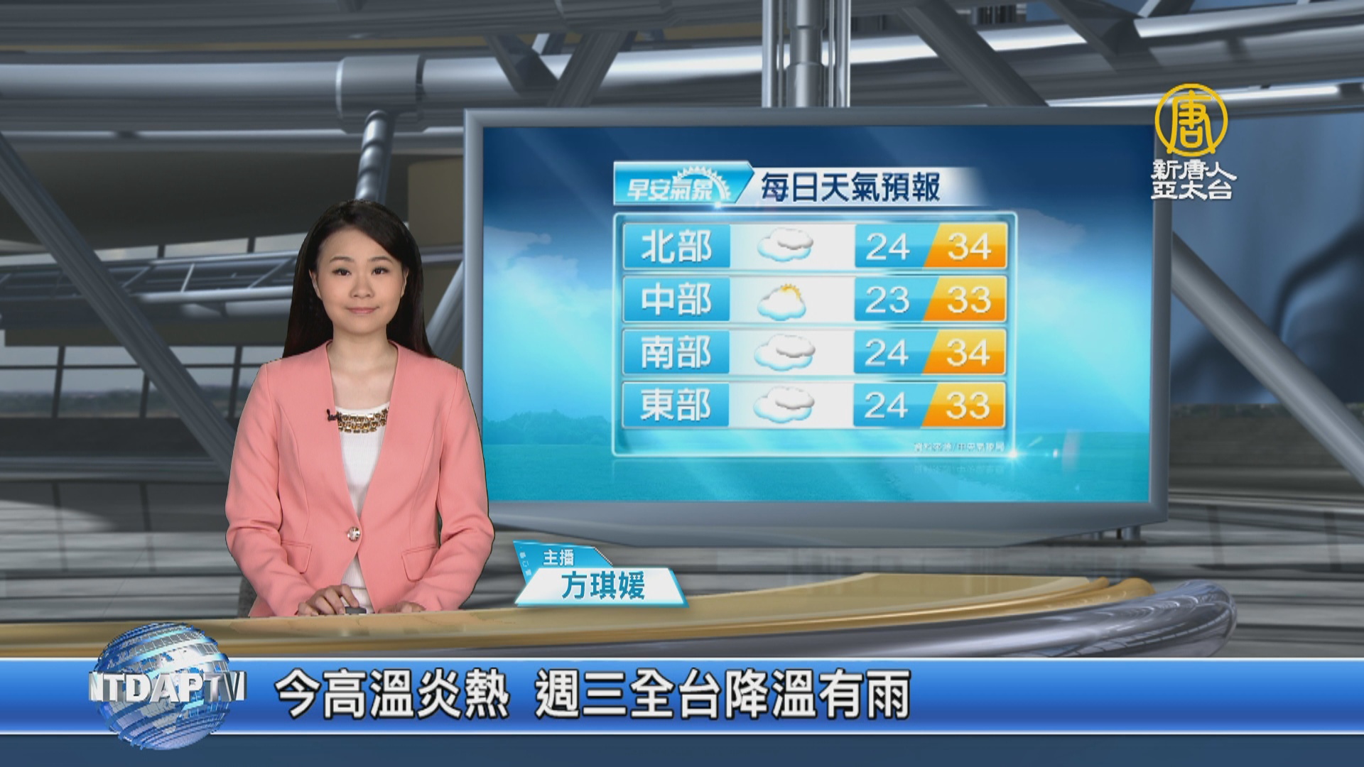 【新唐人亞太台 2019 年 04 月 30 日訊】歡迎您收看4月30日的早安新唐人,我是方琪媛,先來帶您關心今天的天氣情況。今天氣溫會比昨天來得更熱,台東縣和花蓮縣的紫外線指數,會達到「危險級」。星期三,北部會降到20度到26度,全台將出現局部較大雨勢,提醒您留意天氣變化,帶您一起來看到國際媒體重要訊息。