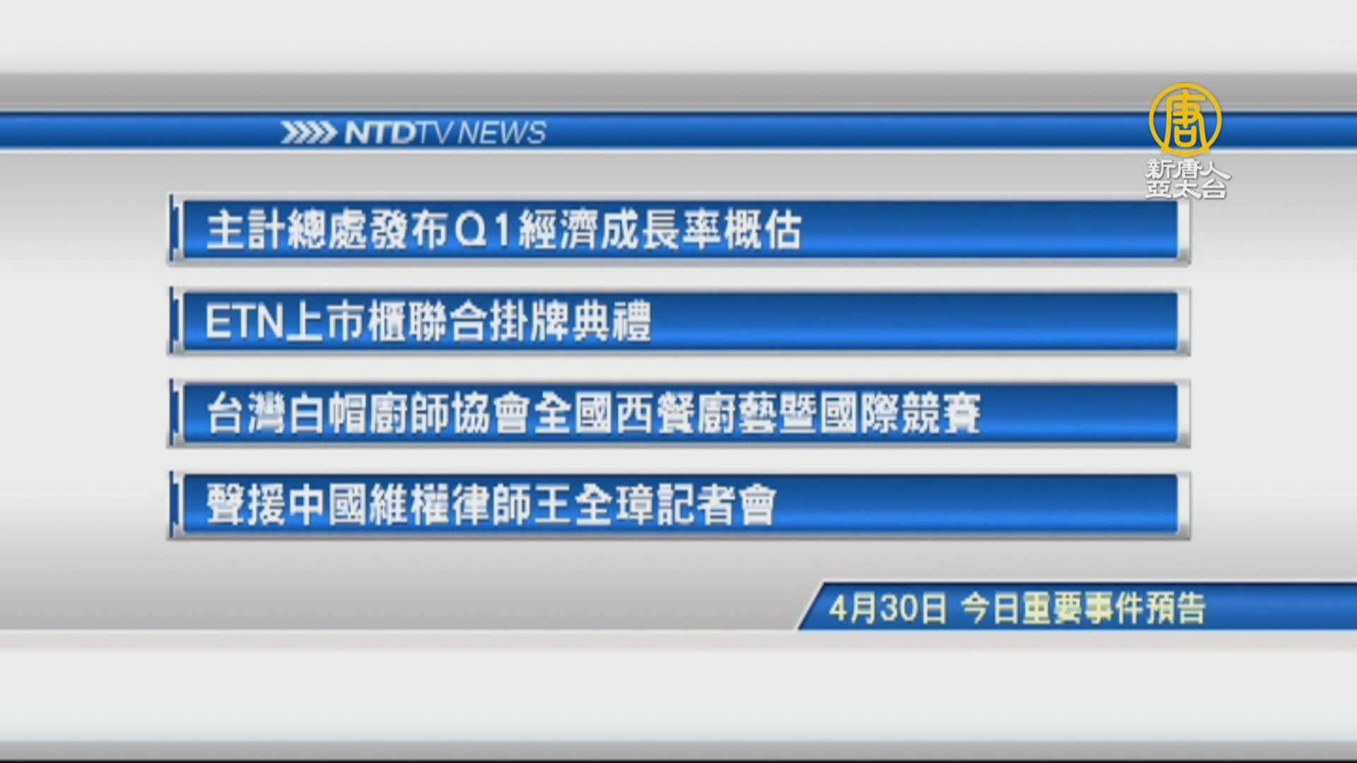 【新唐人亞太台 2019 年 04 月 30 日訊】接著看到,今天,4月30日,星期二 ,有哪些重要活動。首先是,主計總處發布Q1經濟成長率概估,再來是, ETN上市櫃聯合掛牌典禮。接著看到,基隆要舉辦,台灣白帽廚師協會第二屆 全國西餐廚藝 暨國際競賽。最後是,律師郭吉仁和多位立委,今天舉辦,聲援中國維權律師王全璋記者會。