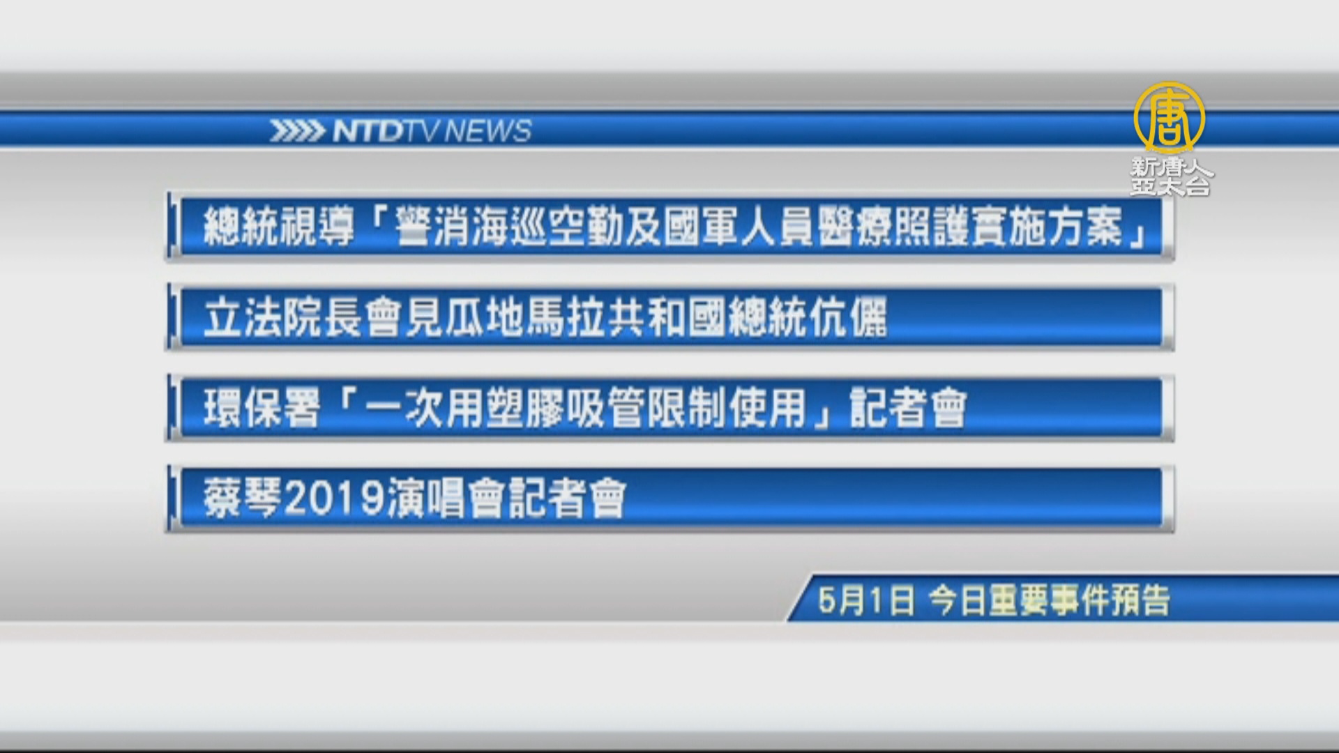 【新唐人亞太台 2019 年 05 月 01 日訊】接著看到,今天,5月1日,星期三 ,有哪些重要活動。首先是,總統視導「警消海巡空勤及國軍人員醫療照護實施方案」。再來是,立法院長會見瓜地馬拉共和國總統伉儷。接著是,環保署「一次用塑膠吸管限制使用」記者會。最後是娛樂消息,蔡琴2019演唱會記者會。
