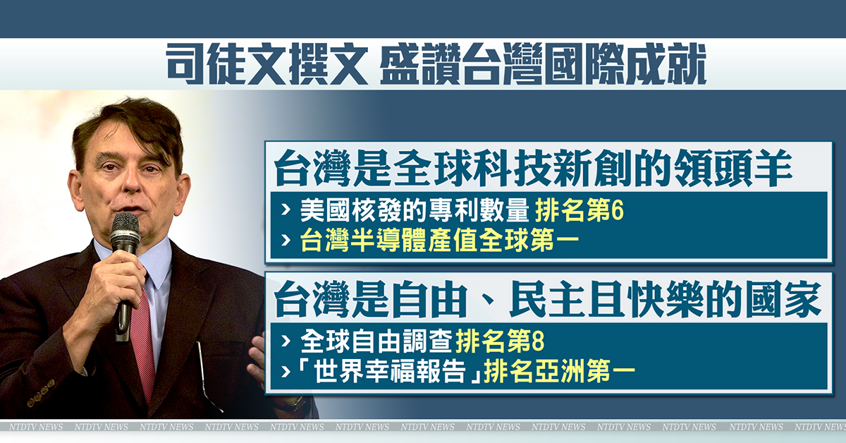 【新唐人亞太台 2019 年 05 月 01 日訊】前美國在台協會處長司徒文,日前撰文,引用多項報告與數據,盛讚台灣在國際上的成就。司徒文表示,有很多台灣人驚訝,他為何會選擇定居台灣,他認為台灣人需要改變對自己國家沒自信的態度,應該更瞭解,台灣在國際上的非凡成就和地位。