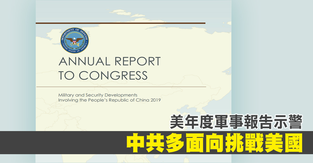【新唐人亞太台 2019 年 05 月 03 日訊】新聞一開始,帶您看到,美國國防部今天(3日)公佈2019年的中國軍力評估報告,指出中共竊取美國科技,用以改良軍力,同時,中共軍隊尋求在更多面向上與美軍競爭,進行「一帶一路」計畫時,也同步擴展海外軍事基地,並繼續在南沙群島上實施軍事化,企圖改變已有的世界秩序。