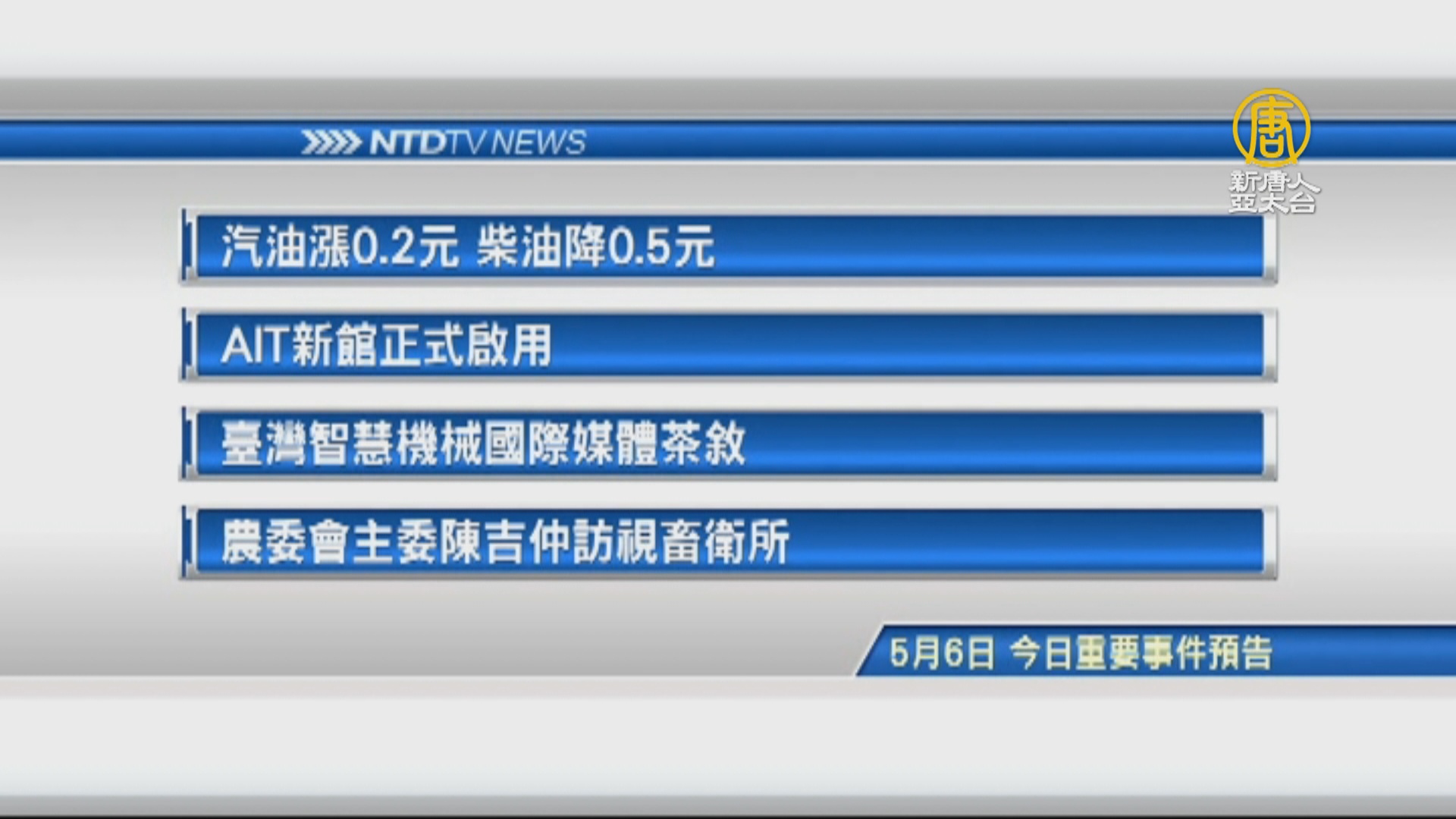 【新唐人亞太台 2019 年 05 月 06 日訊】接著看到,5月6日星期一,有哪些重要活動。首先是民生消息,汽油漲0.2元,柴油降0.5元。再來是,AIT新館正式啟用。另外,今天有一場,臺灣智慧機械國際媒體茶敘。最後是,農委會主委陳吉仲訪視畜衛所。