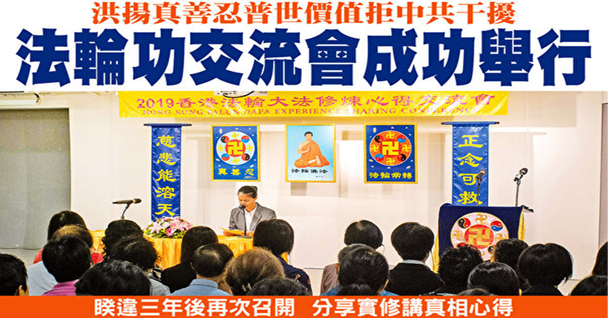 「2019年香港法輪大法修煉心得交流會」星期日早上舉行,會場莊嚴、殊勝,共有18位學員發言,分享他們修煉法輪大法後,身心各方面的昇華,日常生活中實踐「真、善、忍」精神,以及在景點向大陸遊客講真相勸三退的點滴。