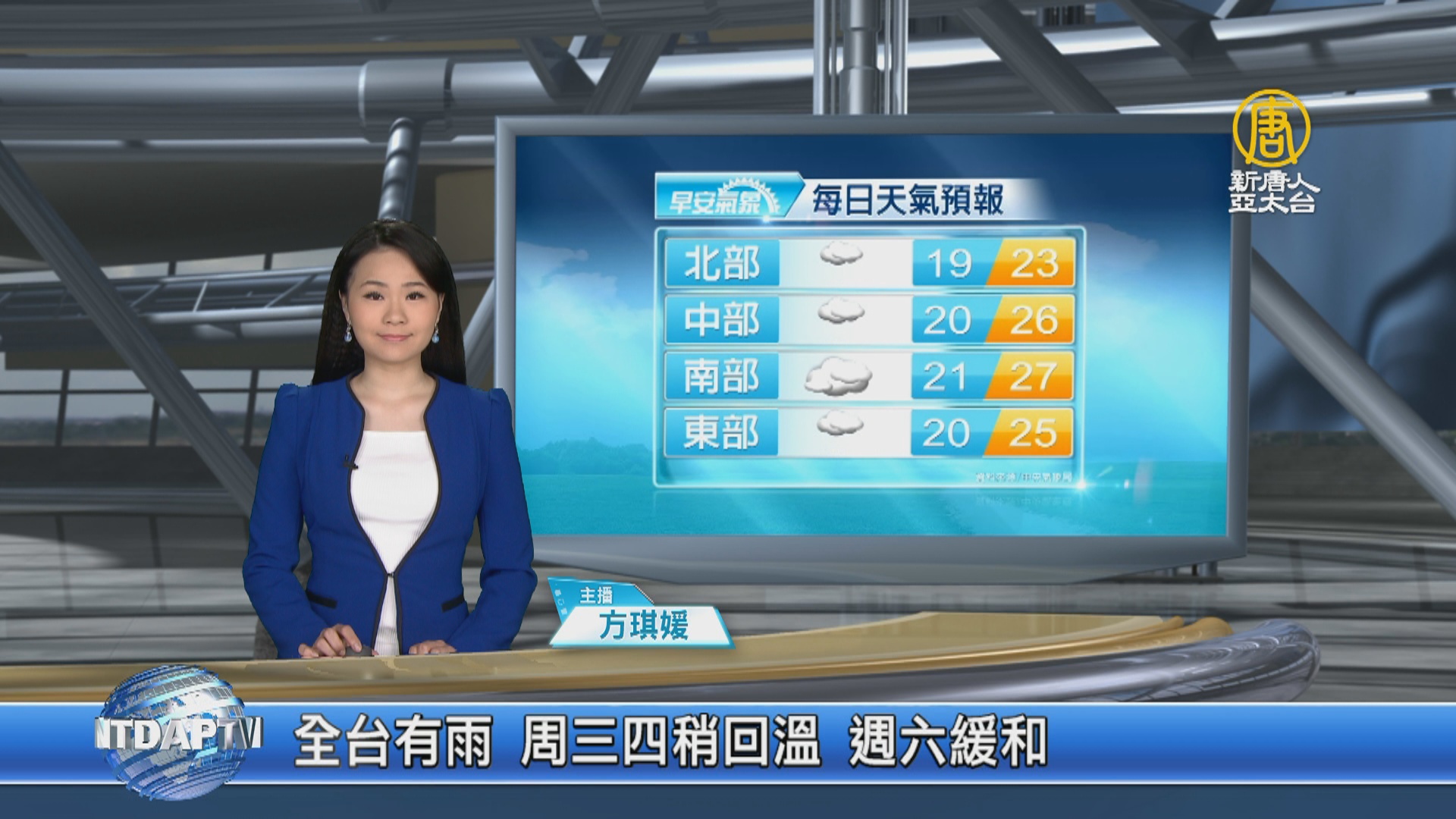 【新唐人亞太台 2019 年 05 月 07 日訊】歡迎您收看5月7日的早安新唐人,我是方琪媛,先來帶您關心今天的天氣情況。今明全台有雨,北台灣整天偏涼,周三四氣溫會稍回溫,周末雨勢會比較緩和。帶您一起來看到國際媒體重要訊息。