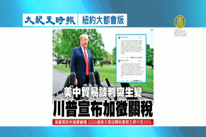 【新唐人亞太台 2019 年 05 月 07 日訊】接著看到大紀元時報紐約大都會版報導:美中貿易談判突然生變,川普宣布加徵關稅。