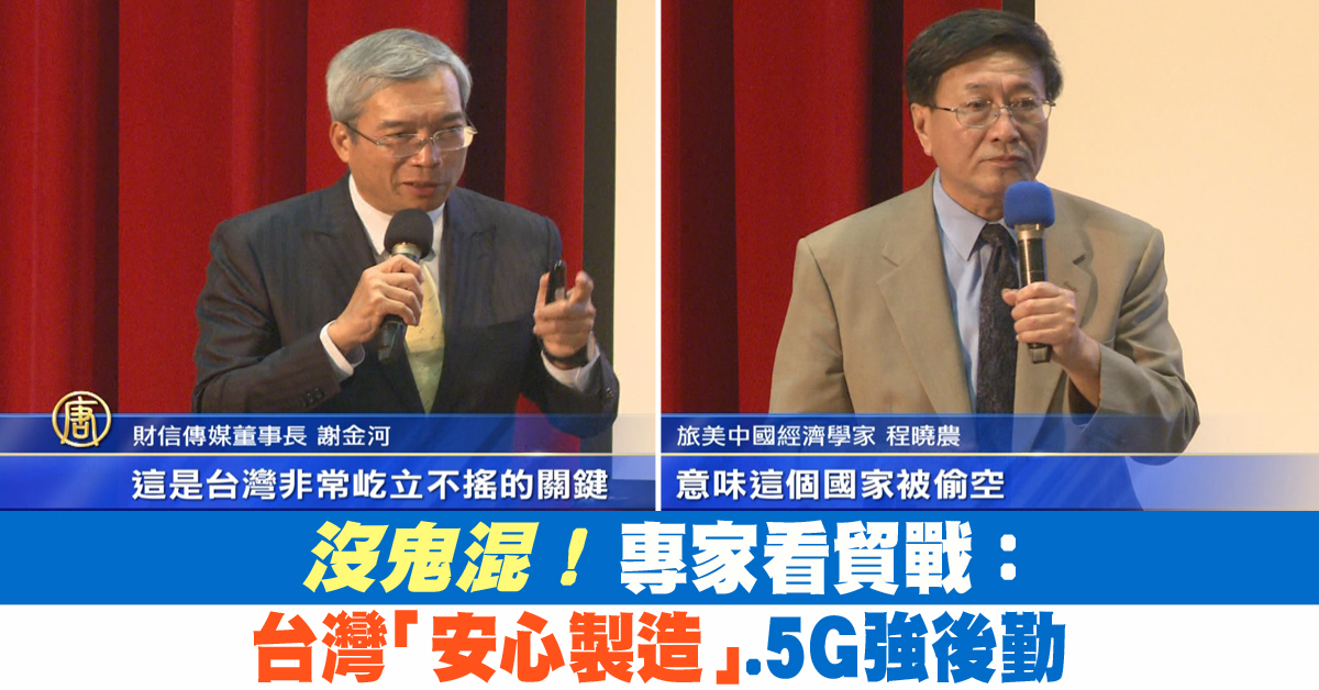 【新唐人亞太台 2019 年 05 月 07 日訊】週日(5日),台美專家座談會探討「面對險惡的2020,台灣如何妥善因應?」專家分析,面對中共20年不公平競爭,台灣企業沒鬼混、走過了死亡幽谷;美中貿易戰下,台灣新定位是「安心製造」,是5G戰場後勤供應鏈。專家看好投資台灣,呼籲政府靈活有魄力,給台商與海外台資,一條回台灣的路。
