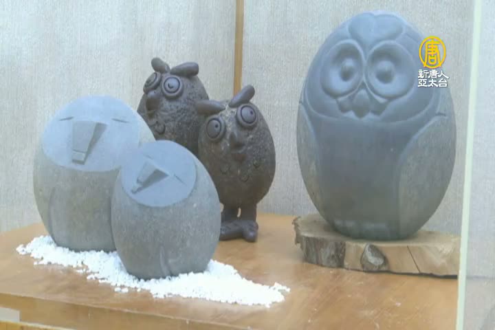 【新唐人亞太台 2019 年 05 月 07 日訊】南投縣展出石雕陶塑展,藝術創作者黃瀅權以陶石的自然紋路,刻劃可愛的豬模樣、神氣昂揚的貓頭鷹,還有各式各樣的作品,相當吸睛。
