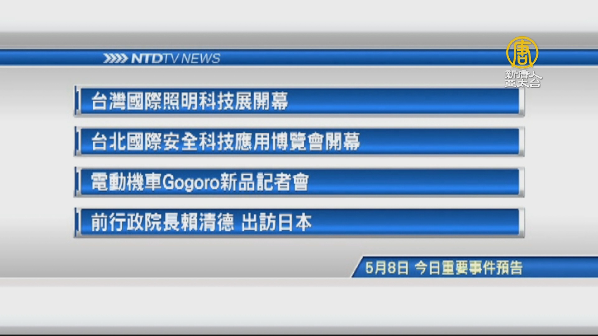 【新唐人亞太台 2019 年 05 月 08 日訊】接著看到,今天,5月8日,星期三 ,有哪些重要活動。首先是,台灣國際照明科技展開幕。再來是,台北國際安全科技應用博覽會開幕。接著是,電動機車Gogoro新品記者會。最後是,前行政院長賴清德,出訪日本。