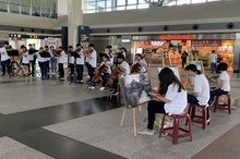 嘉義大學今天在高鐵嘉義站快閃,以悠揚樂聲和繪畫方式,歡慶百週年校慶及母親節。(高鐵嘉義站提供)