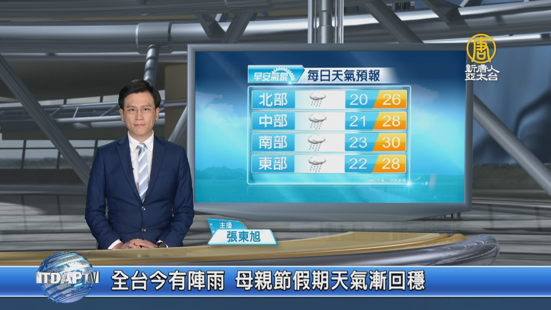 【新唐人亞太台 2019 年 05 月 09 日訊】歡迎您收看5月9日的早安新唐人,我是張東旭,先來帶您關心今天的天氣情況。今天全台都有陣雨機會,高溫會比昨天小幅回升,北部及東北部約24度到26度,其他地區為27度到30度;周六鋒面遠離,預計母親節假期,天氣會漸漸回穩。帶您一起來看到國際媒體重要訊息。