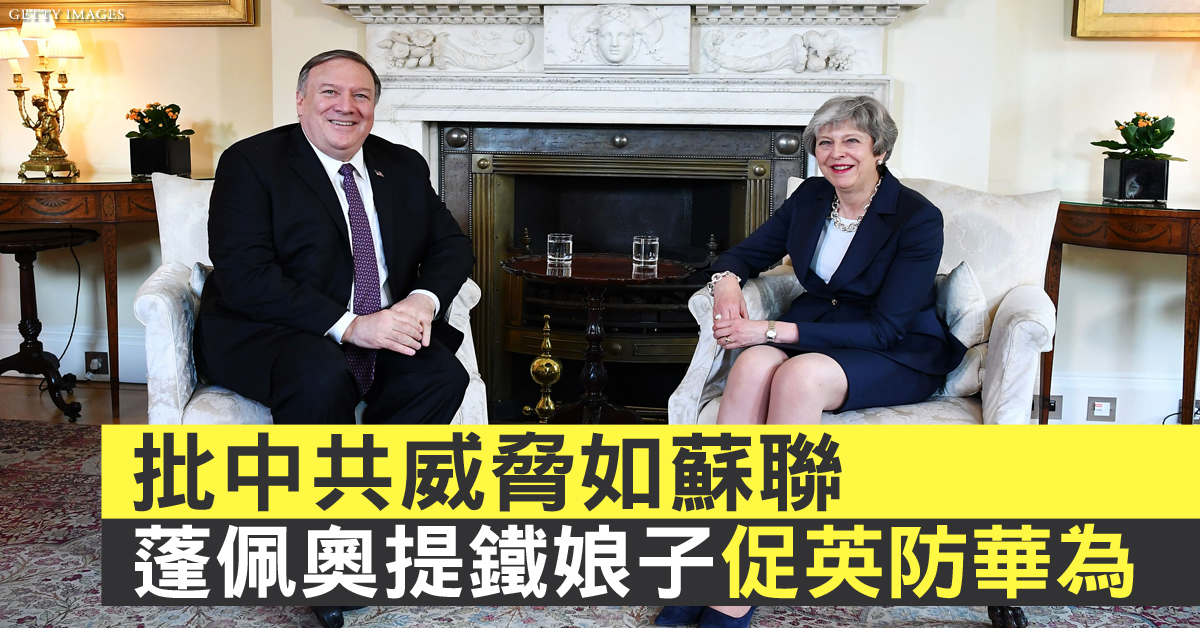美國國務卿蓬佩奧(Mike Pompeo),8日會晤英國首相梅伊(Theresa May)商談5G網路安全,還在倫敦對包括英國國會議員在內的聽眾演說,形容中共威脅有如蘇聯,呼籲英國,應小心警惕並直言不諱,反對中共的種種活動。