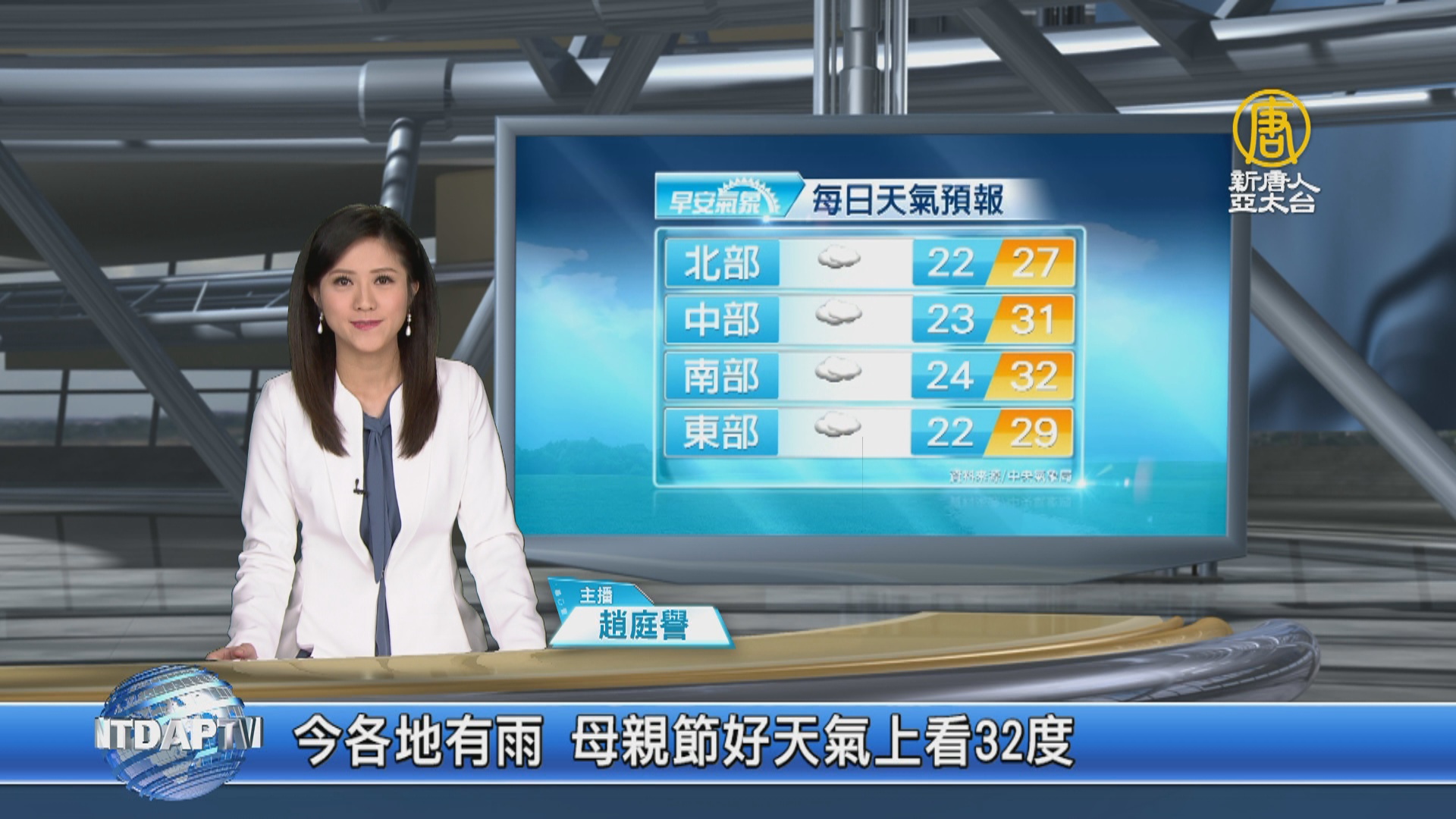 【新唐人亞太台 2019 年 05 月 10 日訊】歡迎您收看5月10日的早安新唐人,我是趙庭譽,先來帶您關心今天的天氣情況。今天鋒面持續影響,白天以前各地有雨,不過,週末會有明顯改變,母親節天氣轉晴,西半部高溫上看32度,民眾可以好好把握。帶您一起來看到國際媒體重要訊息。