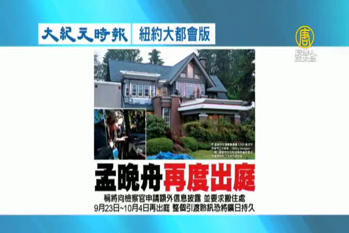 【新唐人亞太台 2019 年 05 月 10 日訊】接著看到大紀元時報紐約大都會版報導:中國華為財務長孟晚舟再度出庭。稱將向檢察官申請額外信息披露,並要求搬住處。9月23號到10月4號再出庭,整個引渡聆訊恐將曠日持久。