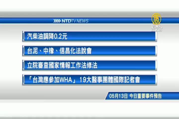 【新唐人亞太台 2019 年 05 月 13 日訊】接著看到,今天,5月13日,星期一 ,有哪些重要活動。首先是,民生消息,汽柴油調降0.2元。再來是,台泥、中橡、信昌化法說會。接著看到,立法院審查國家情報工作法修法。最後是,台灣19大醫事團體國際記者會,呼籲國際支持「台灣參加WHA」 。