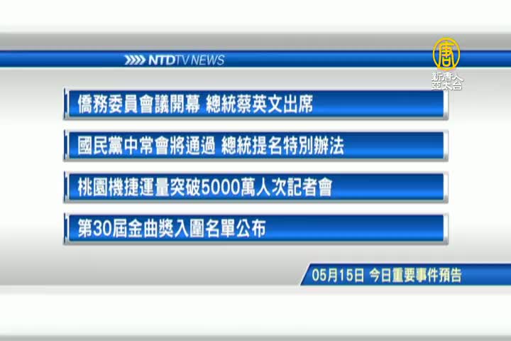 【新唐人亞太台 2019 年 05 月 15 日訊】接著看到,今天,5月15日,星期三 ,有哪些重要活動。首先是,僑務委員會議開幕,總統蔡英文出席。國民黨中常會將通過 總統提名特別辦法。再來是,桃園機捷運量突破5000萬人次記者會。最後是,第30屆金曲獎入圍名單公布。