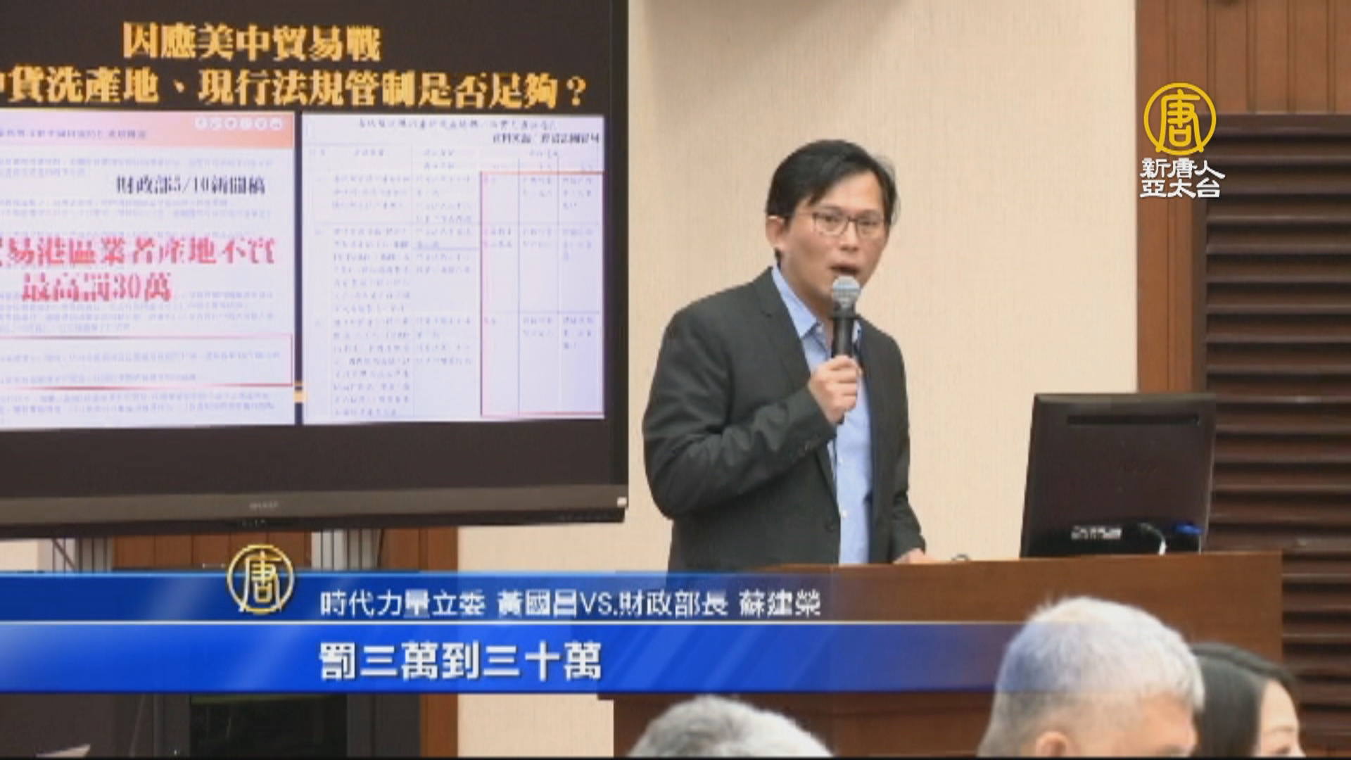 【新唐人亞太台 2019 年 05 月 15 日訊】因應美中貿易戰,台灣要嚴防中國貨“洗產地”出口到美國,砸了MIT品牌。但時代力量立委黃國昌質疑,目前洗產地案件,最高只罰30萬,毫無嚇阻效果。