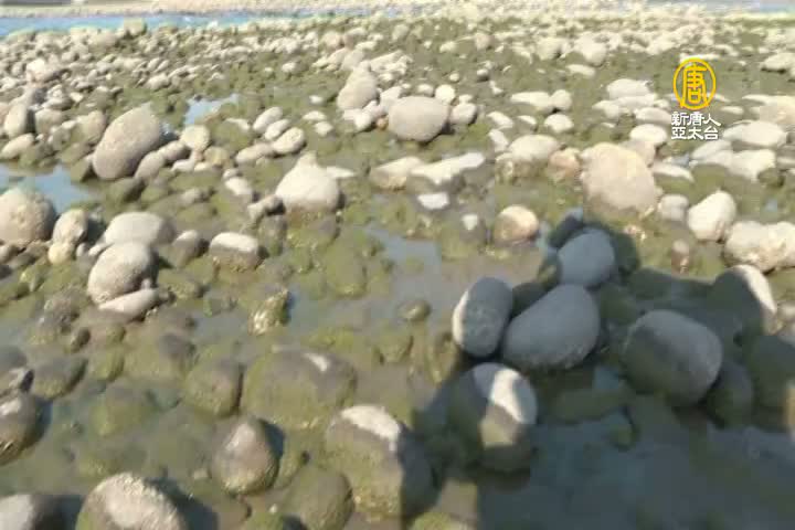 【新唐人亞太台 2019 年 05 月 15 日訊】海水裡竟然有閃閃發亮的抹茶餅!原來是在苗栗苑裡海邊,出現了絕美景色,有大片綠藻,覆蓋在大大小小的岩石上,在陽光的照映下就像灑滿了抹茶粉,顯得翠綠動人。