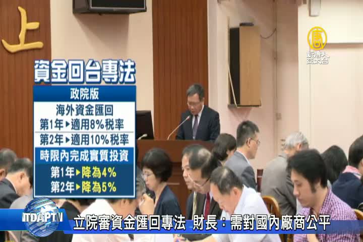【新唐人亞太台 2019 年 05 月 15 日訊】好,迎接台商回流,立法院財政委員會,(15日)初審海外資金匯回專法草案,對於專法的資金回流稅率,是否有再降低的空間?財政部長蘇建榮重申,要考量對國內投資廠商的公平性,目前草案版本,第1年內匯回稅率8%,第2年10%,已經是相對優惠的稅率。