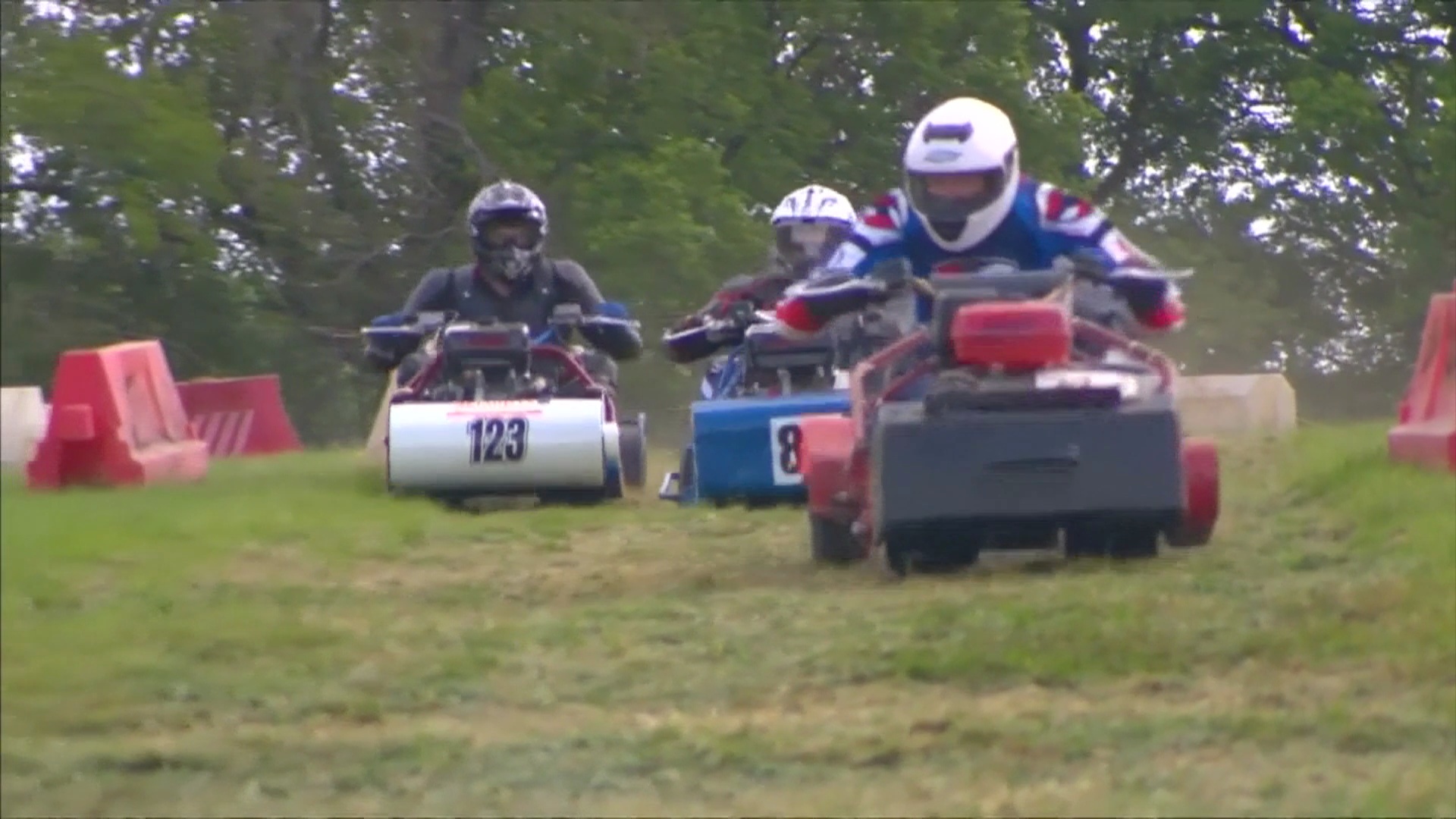 伴隨著發動機的轟鳴聲,比賽開始,人們騎著割草機飛奔,向終點衝去。